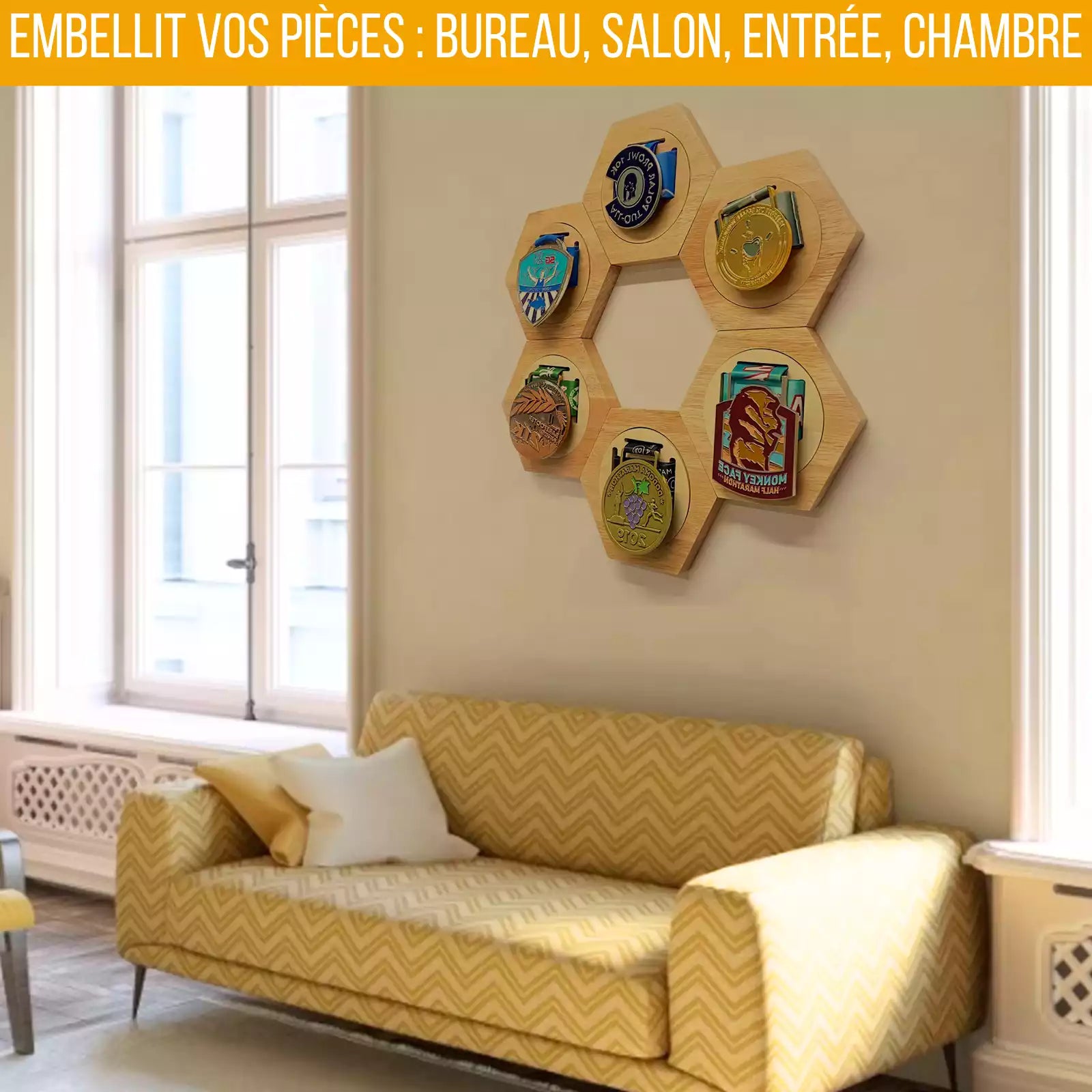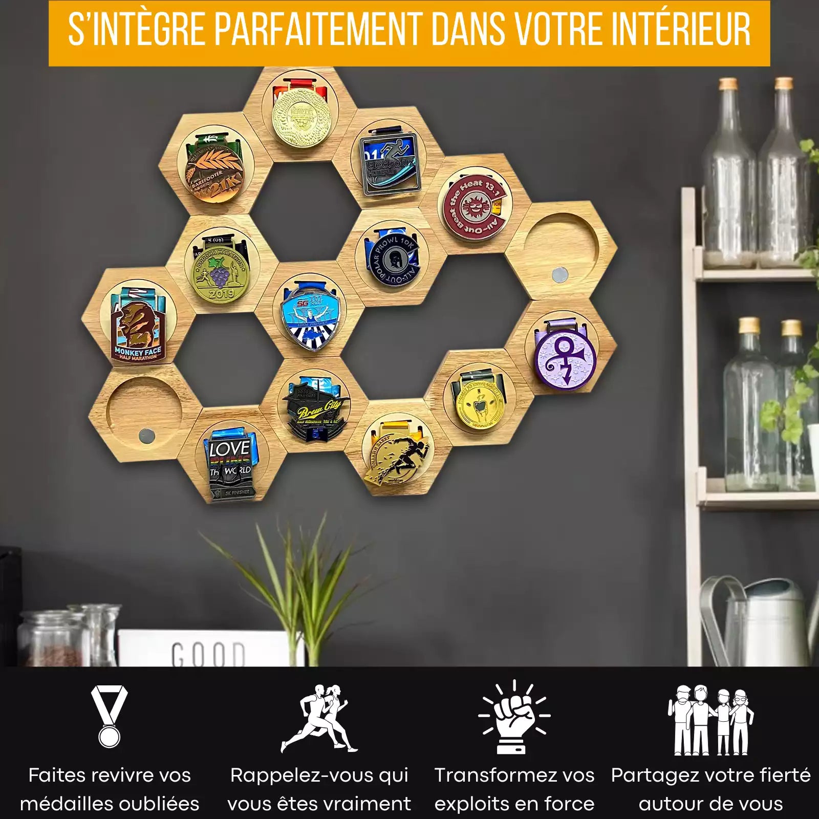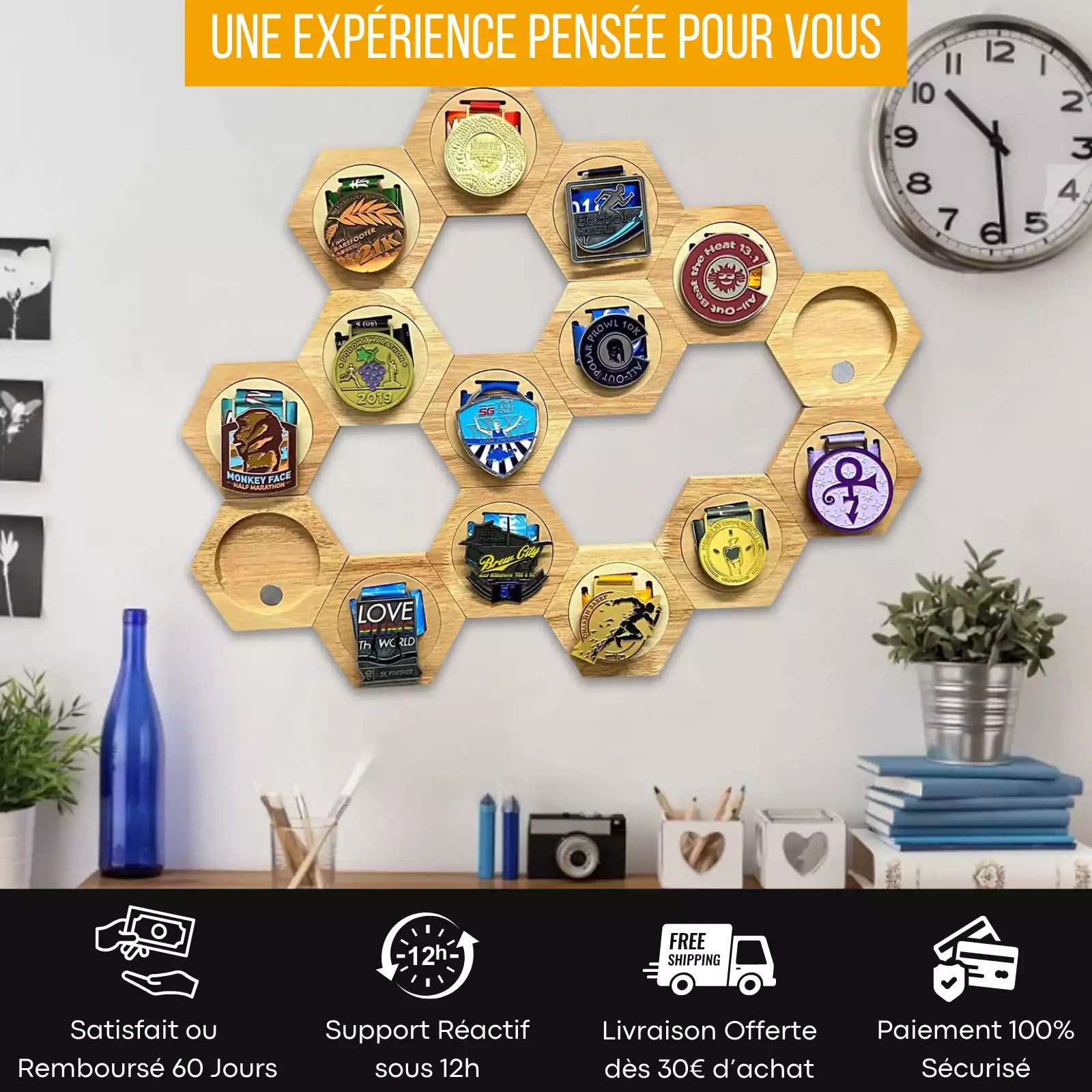 Este soporte adhesivo de pared de madera de pino le permite crear un muro de medallas único, gracias a sus grandes módulos de 14cm combinables en forma de “panal de abejas”.